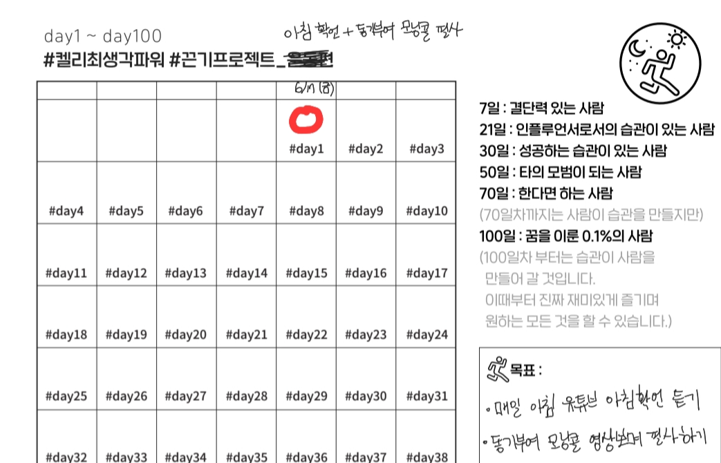 움직이지 않고 생각만 하면 아무런 변화도 일어나지 않는다. 그래서 나는 블로그를 시작했고, 매일 아침 작은 습관만들기를 시작했다. 위 끈기프로젝트 100일 습관표를 다 채웠을 때의 나는 지금의 나보다 훨씬 성장한 멋있는 모습이 되어있을 것이라고 확신한다. 위의 표를 다 채웠을 때의 내가 지금의 나와 무엇이 어떻게 달라졌는지 블로그에 꼭 리뷰를 작성하겠다!